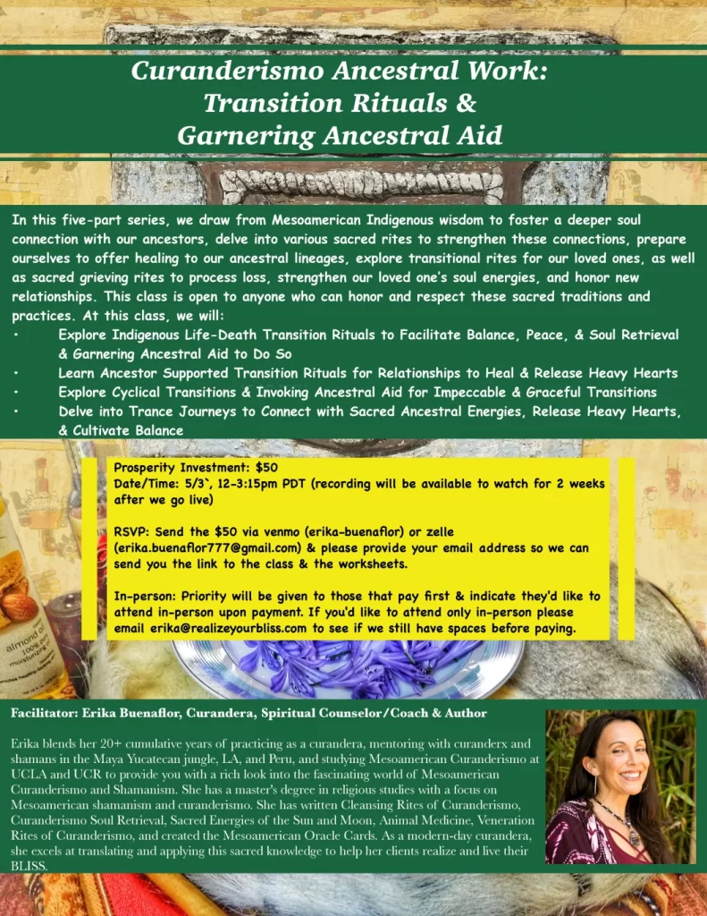 In this five-part series, we draw from Mesoamerican Indigenous wisdom to foster a deeper soul connection with our ancestors, delve into various sacred rites to strengthen these connections, prepare ourselves to offer healing to our ancestral lineages, explore transitional rites for our loved ones, as well as sacred grieving rites to process loss, strengthen our loved one’s soul energies, and honor new relationships. This class is open to anyone who can honor and respect these sacred traditions and practices.