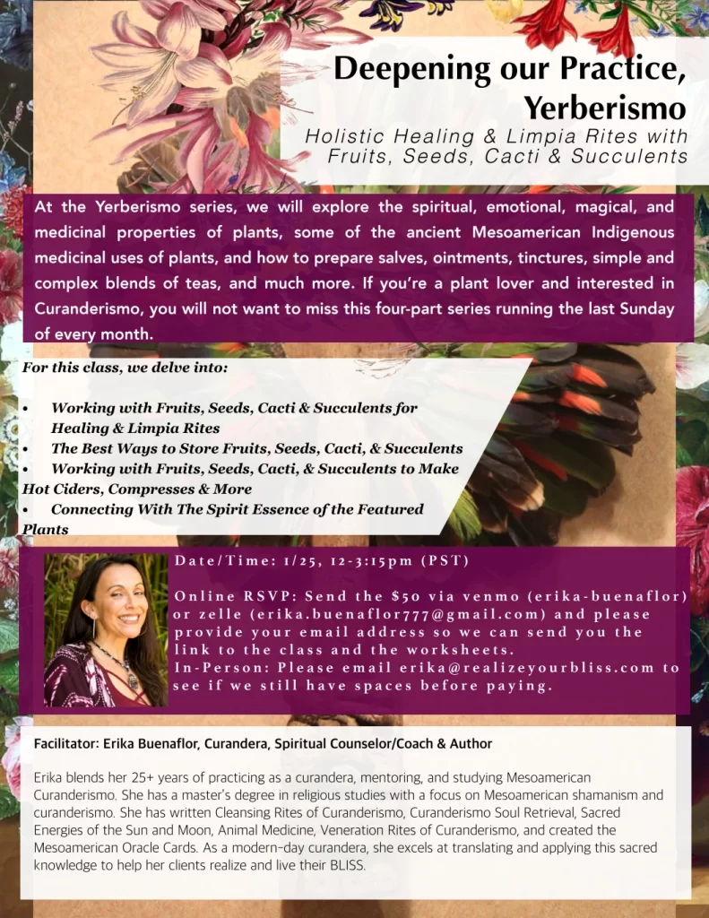 Online RSVP: Send the $50 via venmo (erika-buenaflor) or zelle (erika.buenaflor777@gmail.com) & please provide your email address so we can send you the link to the class & the worksheets. The worksheets and link will go out 1/24. If you attended the 1/11 Fire Limpias Class, this class is ½ off.