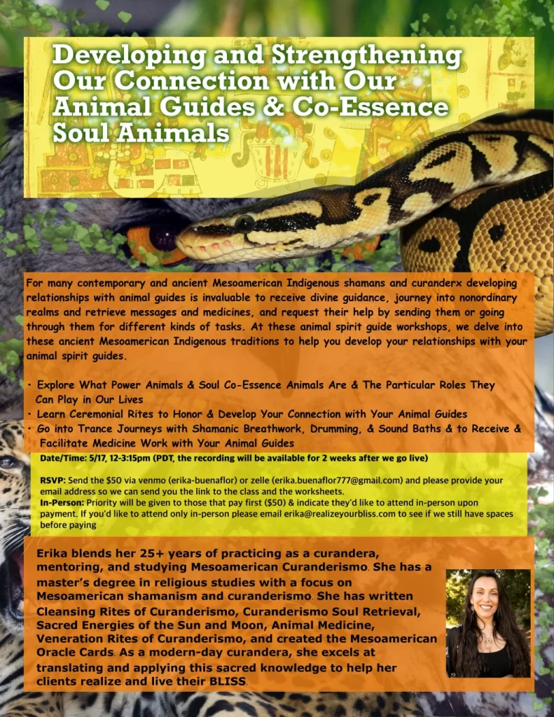 For many contemporary and ancient Mesoamerican Indigenous shamans and curanderx developing relationships with animal guides is invaluable to receive divine guidance, journey into nonordinary realms and retrieve messages and medicines, and request their help by sending them or going through them for different kinds of tasks. At these animal spirit guide workshops, we delve into these ancient Mesoamerican Indigenous traditions to help you develop your relationships with your animal spirit guides.