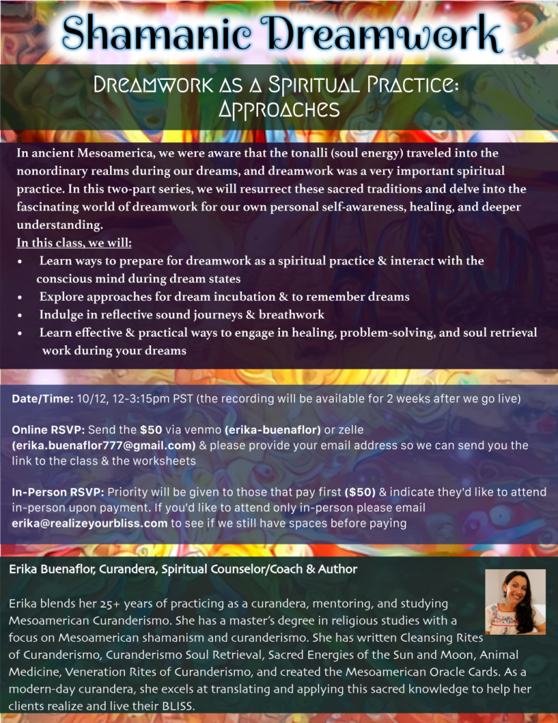 Online RSVP: Send the $50 via venmo (erika-buenaflor) or zelle (erika.buenaflor777@gmail.com) & please provide your email address so we can send you the link to the class & the worksheets. The link & worksheets will go out 10/11.
