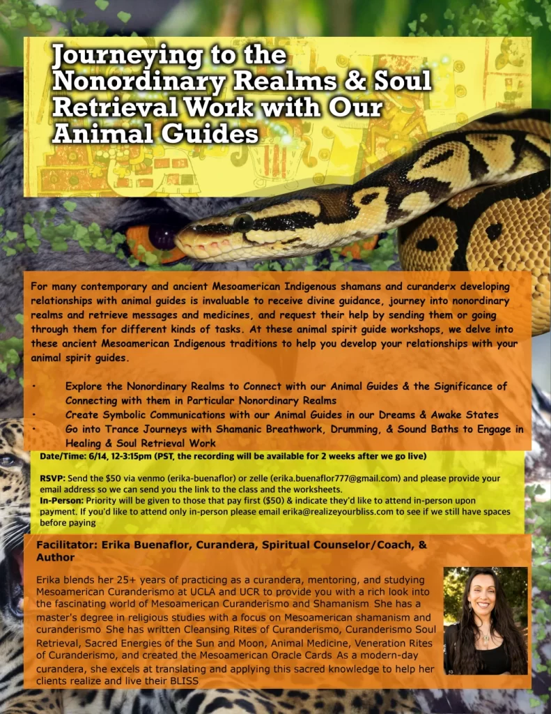 For contemporary and ancient Mesoamerican Indigenous shamans developing relationships with animal guides is invaluable to receive divine guidance, journey into nonordinary realms and retrieve messages and medicines, and request their help by sending them or going through them for different kinds of tasks. At these animal spirit guide workshops, learn about these ancient Mesoamerican Indigenous traditions and develop your relationships to your animal spirit guides.